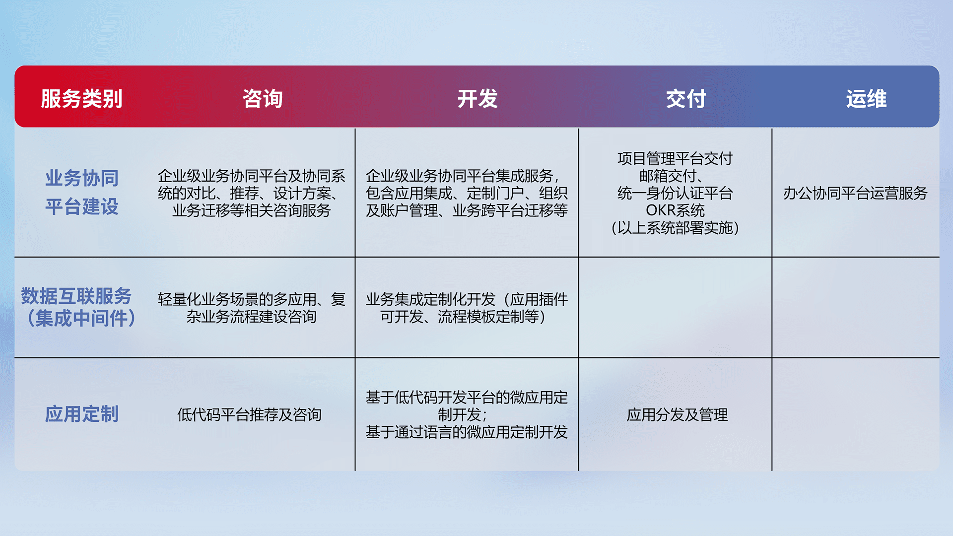 针对钉钉、、、企微、、IDaas等平台级产品提供产品的规划、、、方案、、、、交付、、、定制化开发等服务,,,实现如统一协同办公、、、智能客户服务、、、混合会议管理、、智能数据查询、、、等业务场景,,,,实现数字化转型。。。。